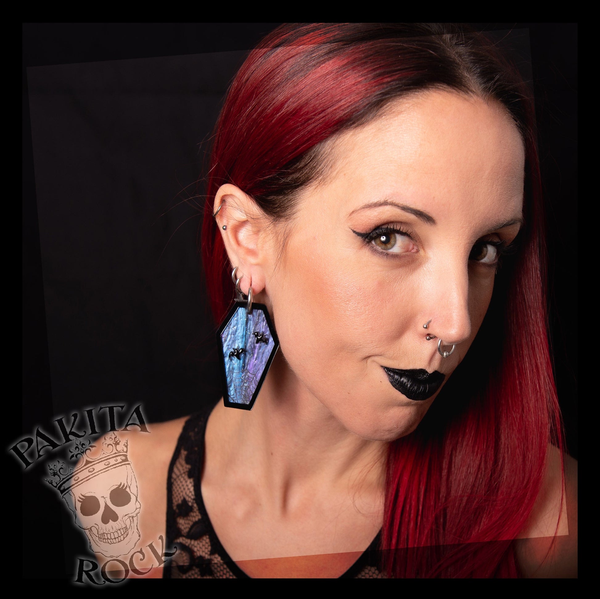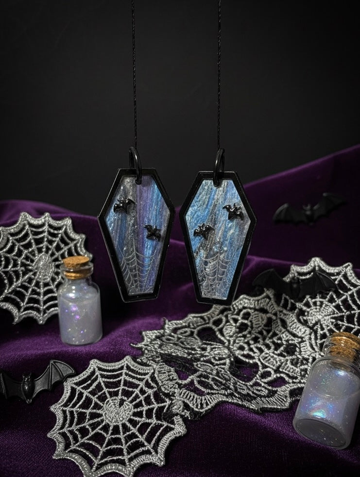 Cada pendiente tiene forma de ataúd con un borde negro brillo. El interior es una superficie de un azul, morado y negro iridiscente que evoca un cielo nocturno. Sobre esta superficie, hay pequeños murciélagos negros de resina que parecen volar y una telaraña grabada finamente detallada en la parte inferior.