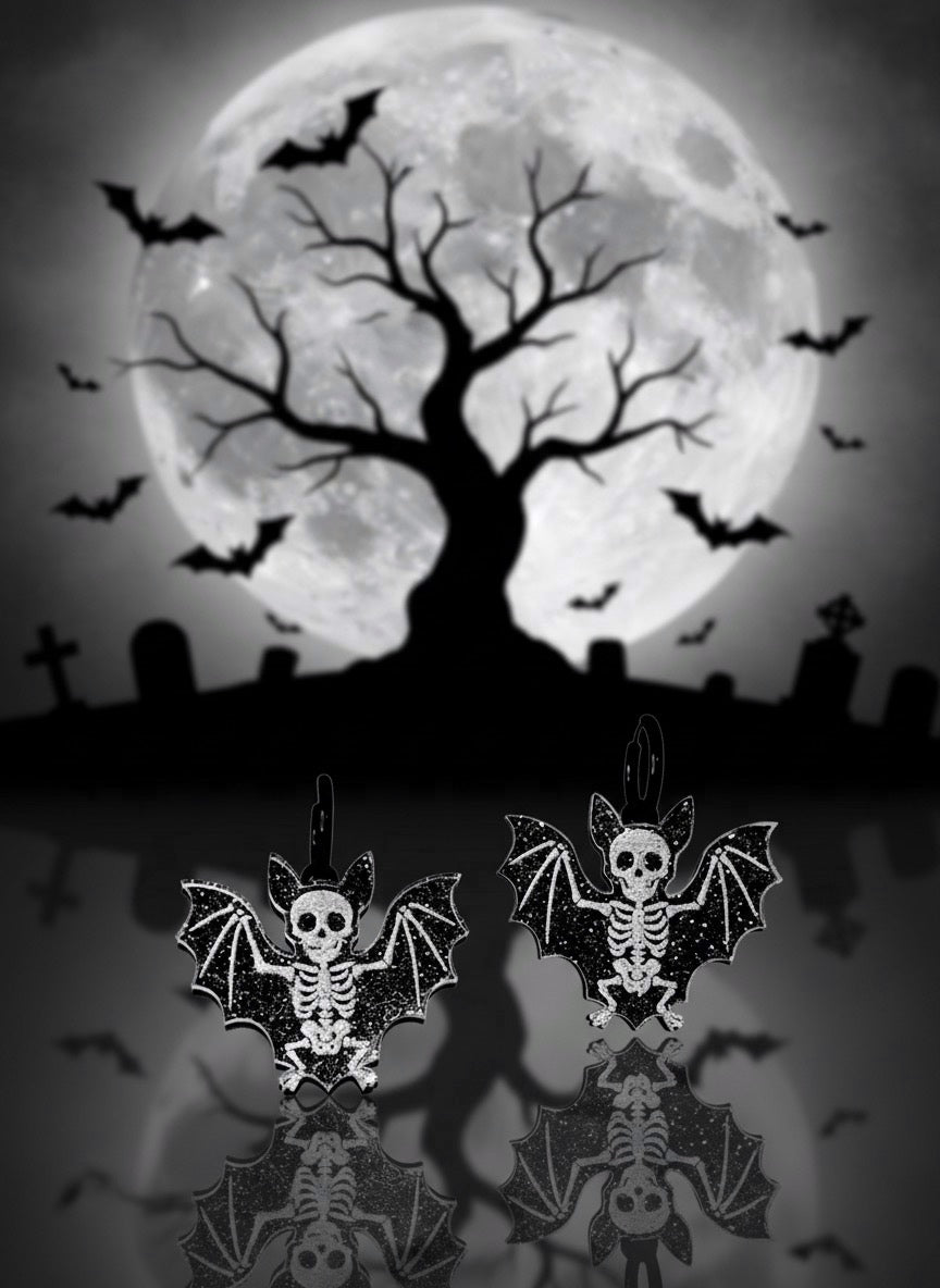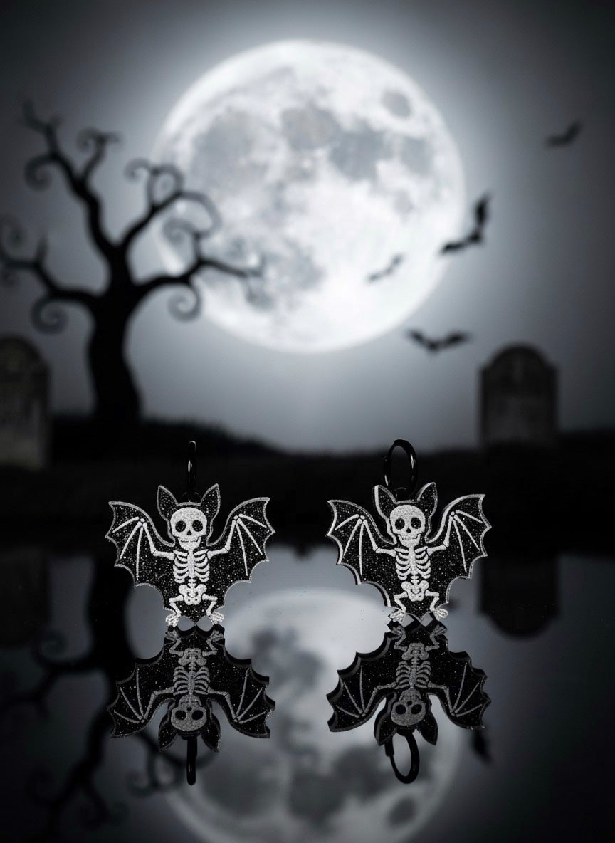 Estos pendientes son la combinación perfecta, con un toque de brillo ideal para Halloween. Los pendientes "Murciélago Esqueleto" presentan a un murciélago en una pose de vuelo, con sus alas extendidas y un cuerpo de esqueleto.